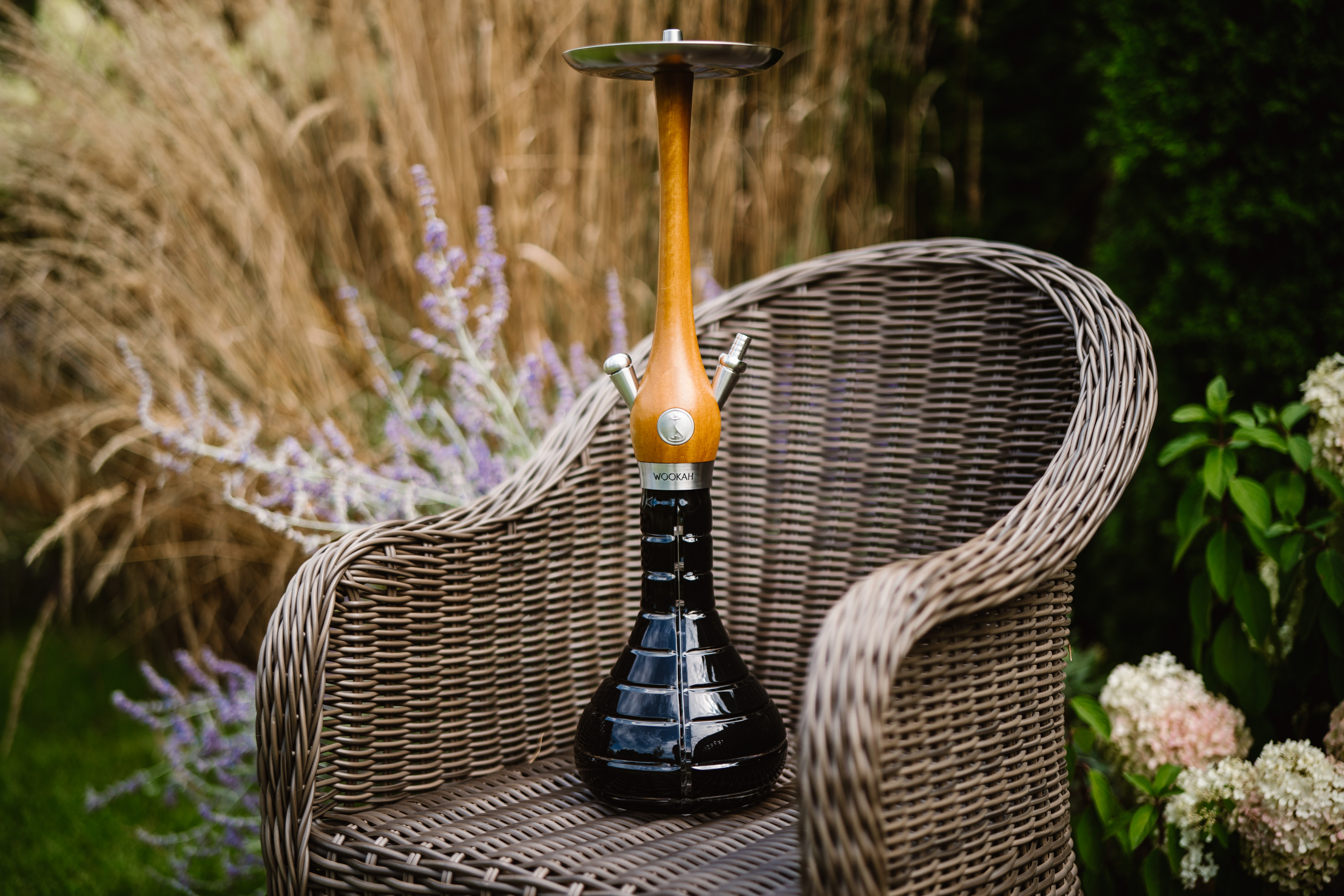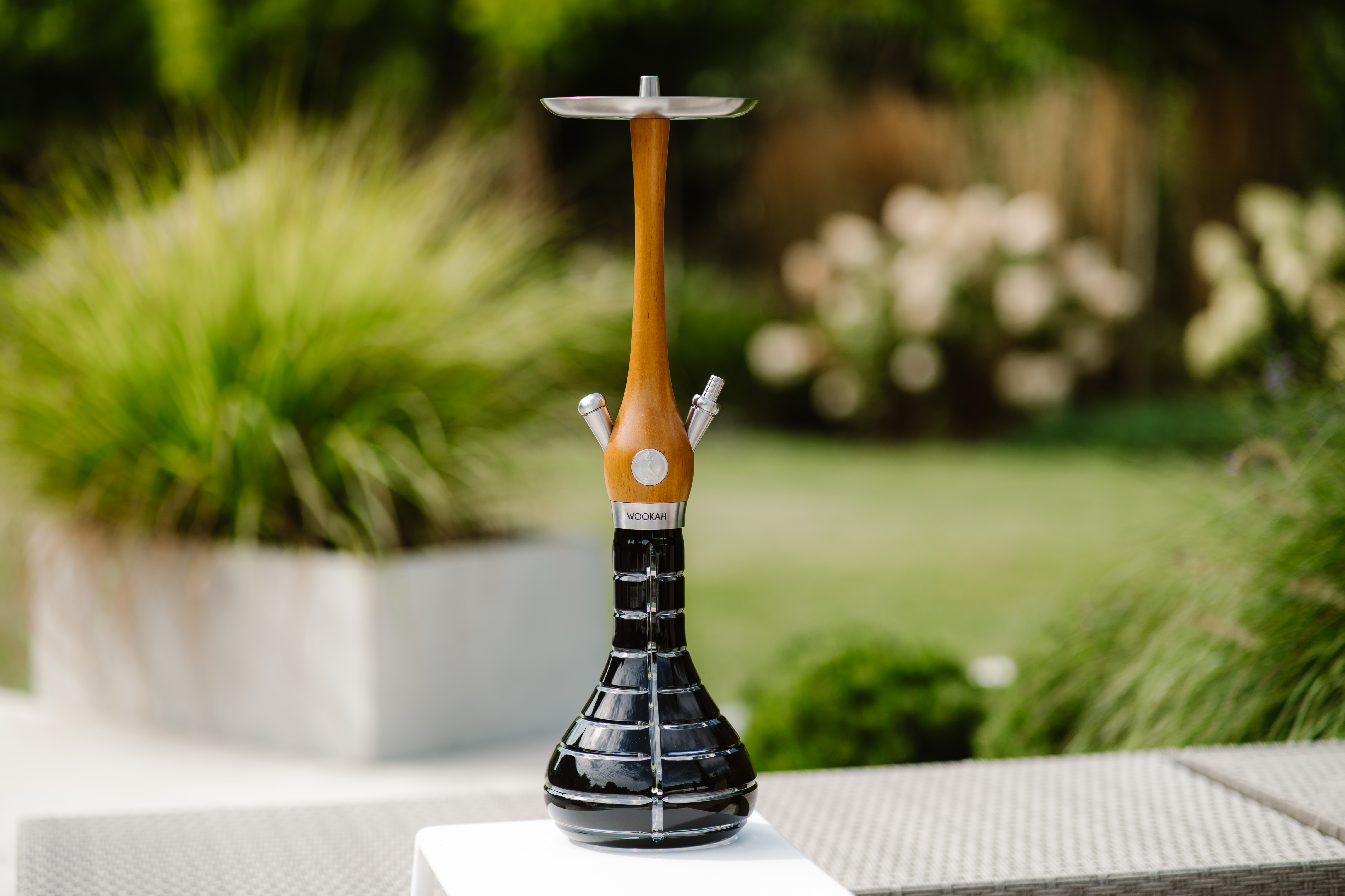 The harmony of Iroko’s golden warmth with the handcrafted Striped Black vase creates a strong, confident identity suitable for premium venues.